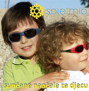 Predstavljamo vam kolekciju dječjih sunčanih naočala SOLE MIO koje zadovoljavaju i najzahtjevnije norme prilikom zaštite očiju vašeg djeteta. Ispitane su u Hrvatskoj po važećoj normi HRN EN 1836. Polikarbonatne leće imaju odgovarajući UV certifikat kojim 100 % sprečavaju prodor UV zraka i imaju kategoriju filtra 3 koji je najpodesniji za ljetne mjesece. Naše naočale se svojom fleksibilnošću prilagođavaju dječjoj glavi, a ujedno su i otporne na igru u dječjim rukama. Noseći naočale SOLE MIO vaše ce dijete bezbrižno i sigurno uživati u igri na suncu.